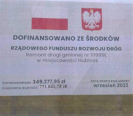 W dniu 13.09.2023roku Wójt Gminy Ulhówek Pan Łukasz Kłębek podpisał umowę z Wojewodą Lubelskim o udzielenie w roku 2023 dofinansowania ze środków Rządowego Funduszu Rozwoju Dróg celem realizacji przedmiotowej drogi.